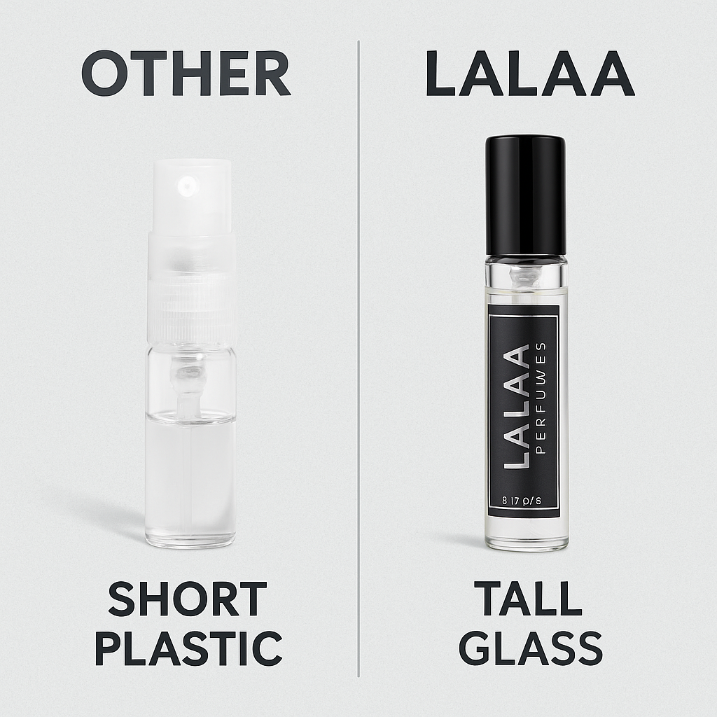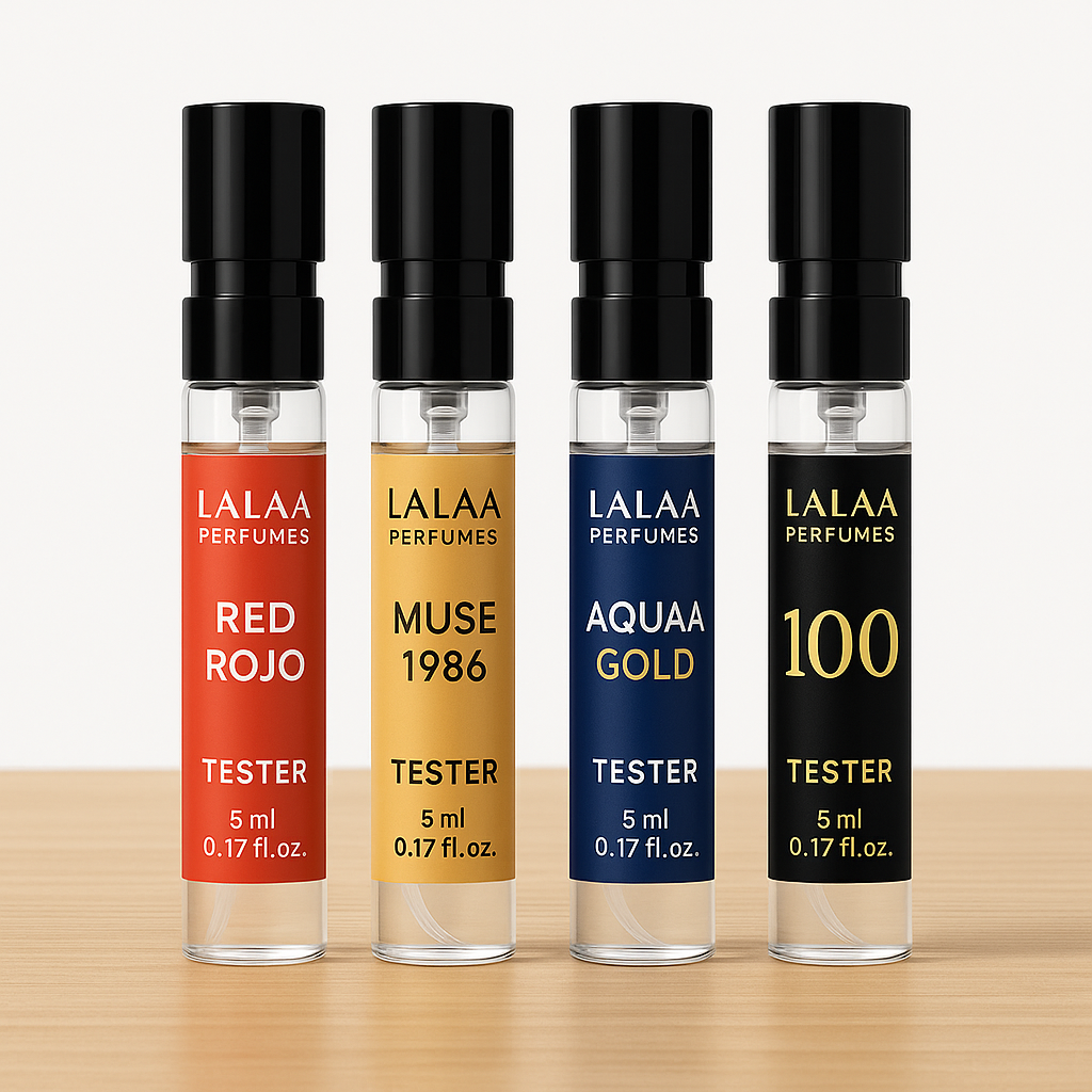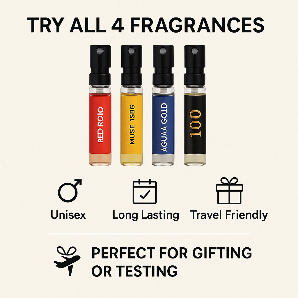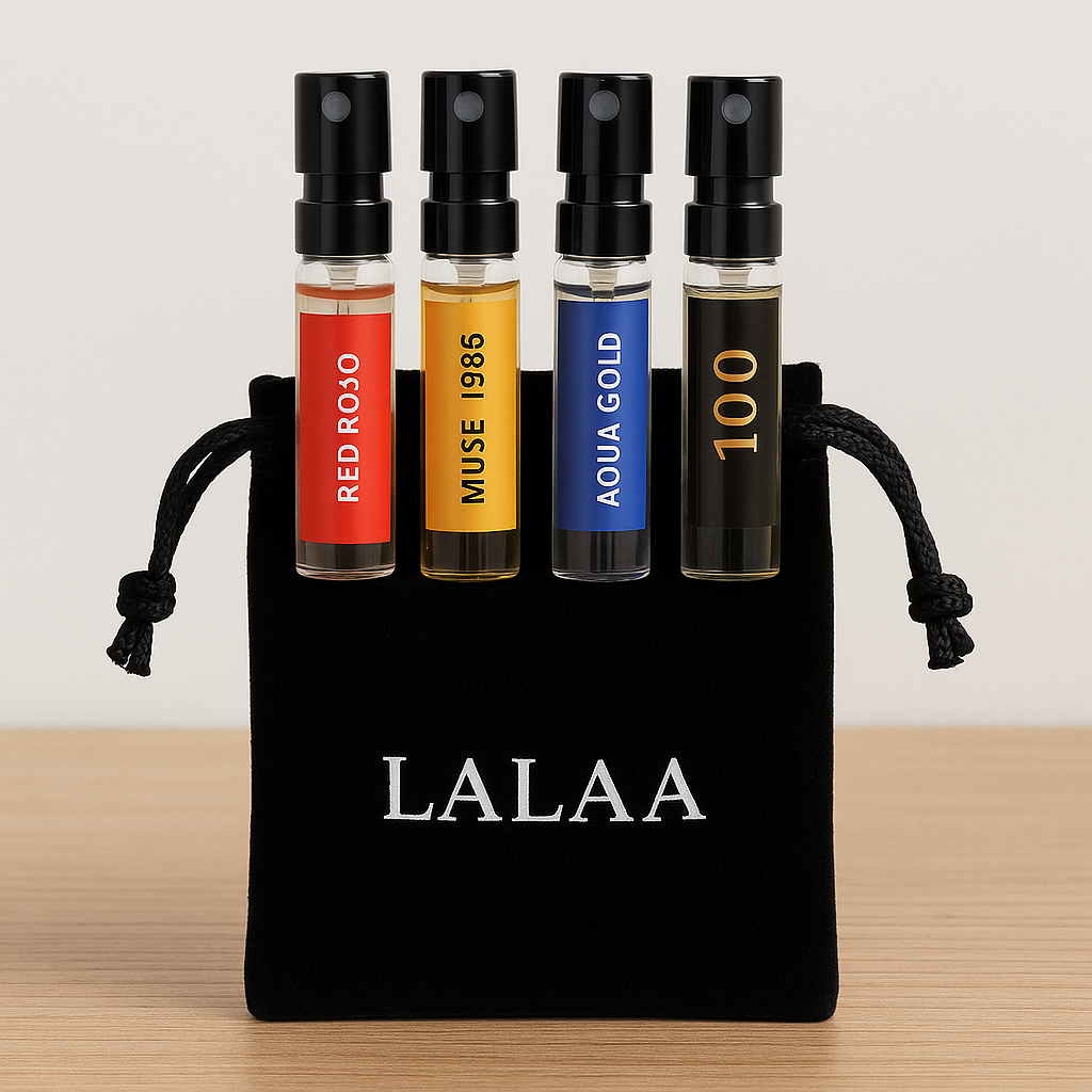 LALAA Luxury Perfume Sample Tester Pack – Set of 4 Premium Long Lasting Fragrances (5ml x 4) | Unisex Travel-Size Discovery Kit | Includes Muse 1986, Aquaa Gold, Red Roja & 100